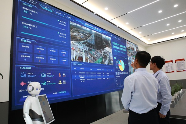图为“电小九”在智慧工地系统大屏前向旅行学习职员举行展示