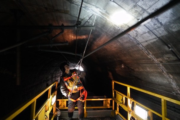 图为桥隧工樊计林正在使用钢钎检查隧道病害