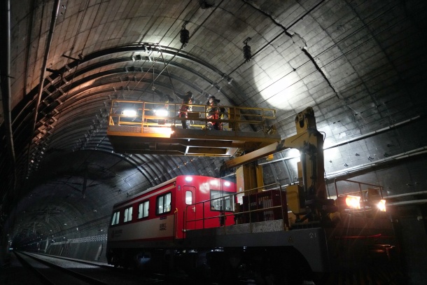 图为排查职员对隧道衬砌举行巡视
