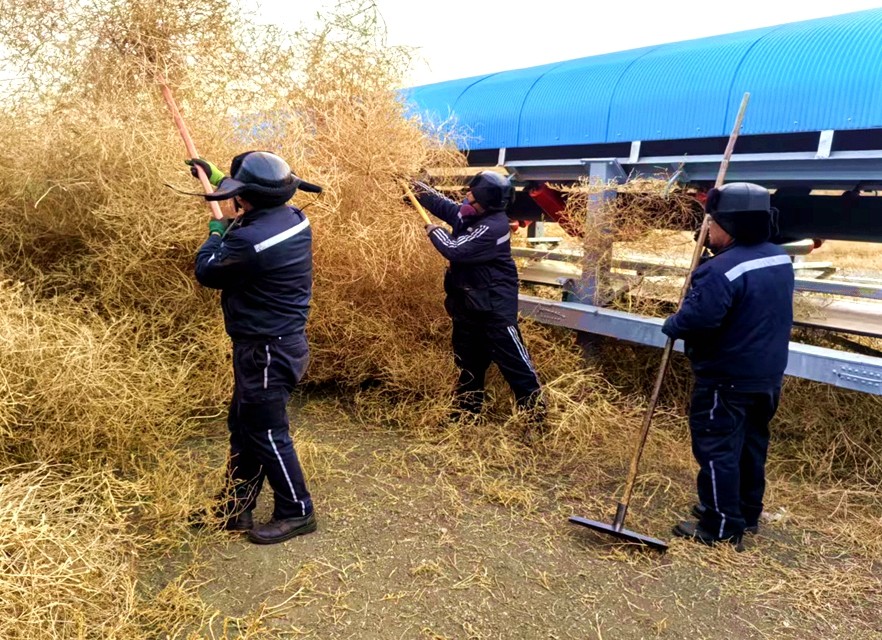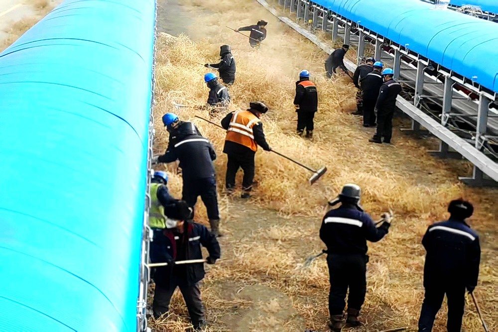 图为储运中心破碎筛分部员工整理输煤皮带周边群集如山的“风滚草”